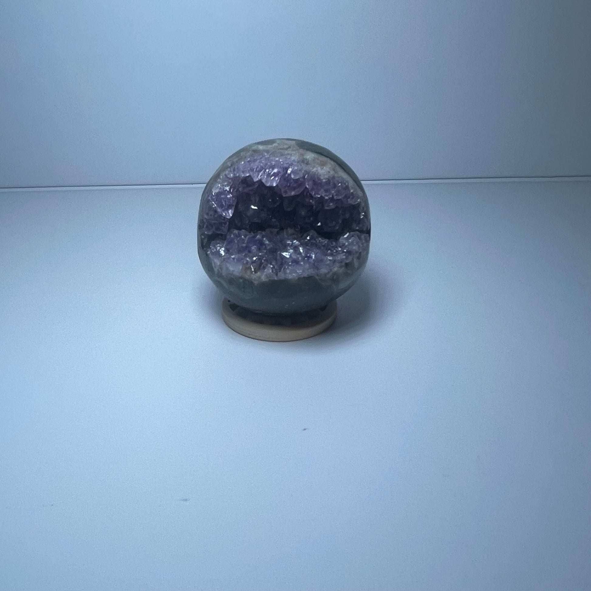 Gemmy and vibrant, this Amethyst Geode Sphere weighs approximately 5 oz and sparkles with rich purple crystal formations. Its polished surface reveals the depth and natural beauty of the stone, radiating calming energy with every angle.