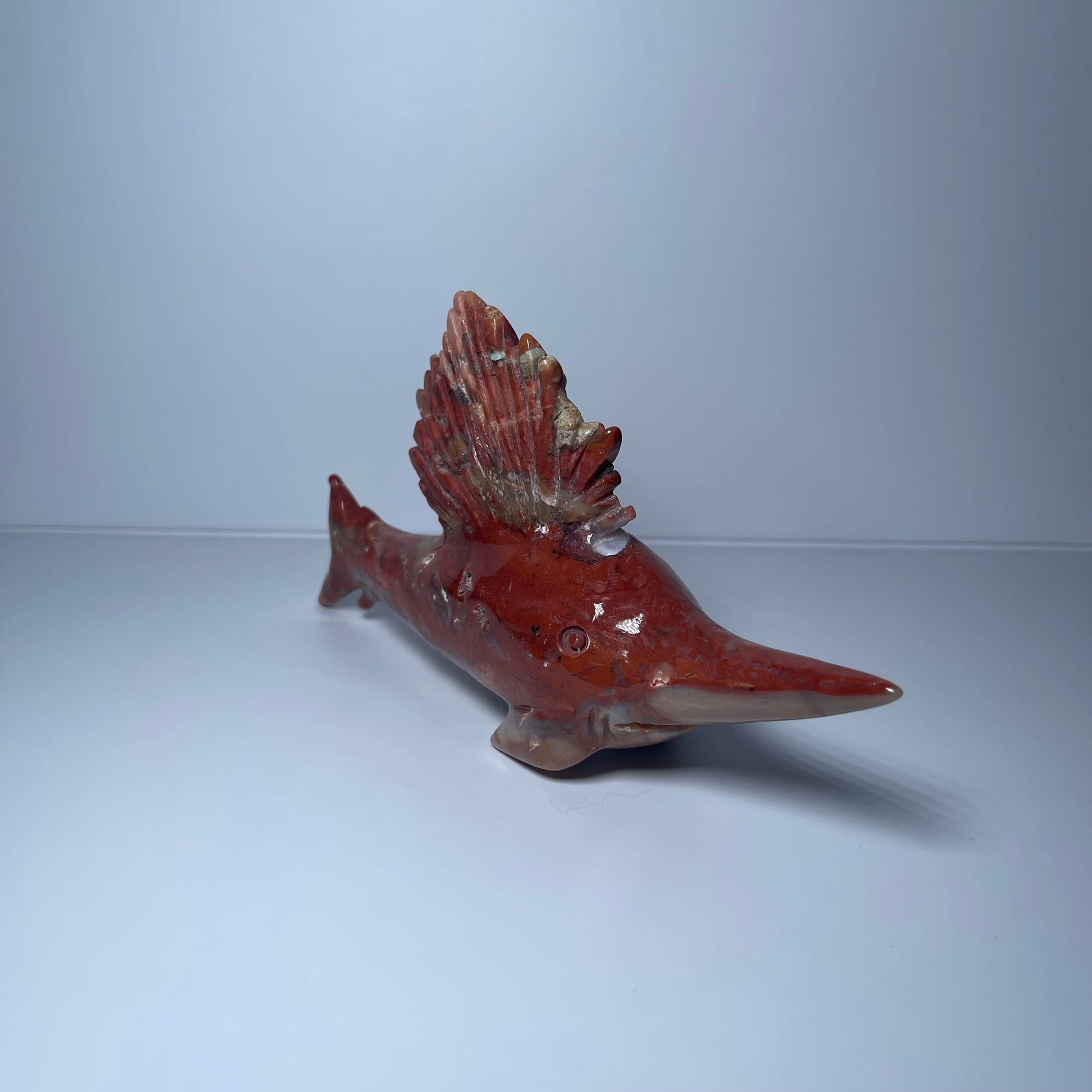 Carved in striking detail, this 7.5-inch Brecciated Jasper Sailfish stands 4 inches tall and weighs approximately 11 oz — a vibrant expression of motion & strength captured in stone.