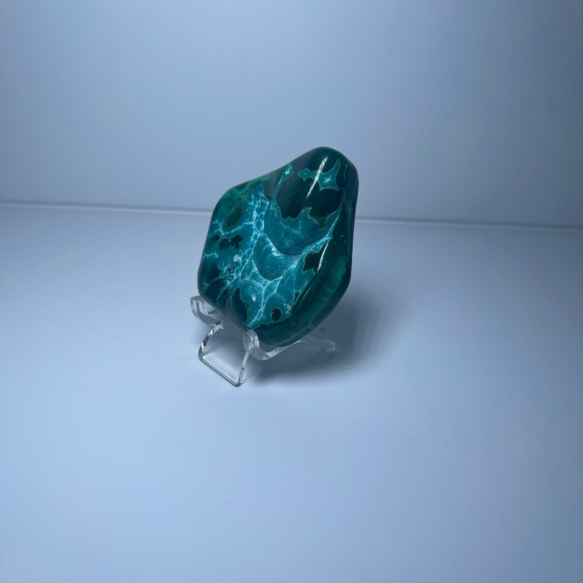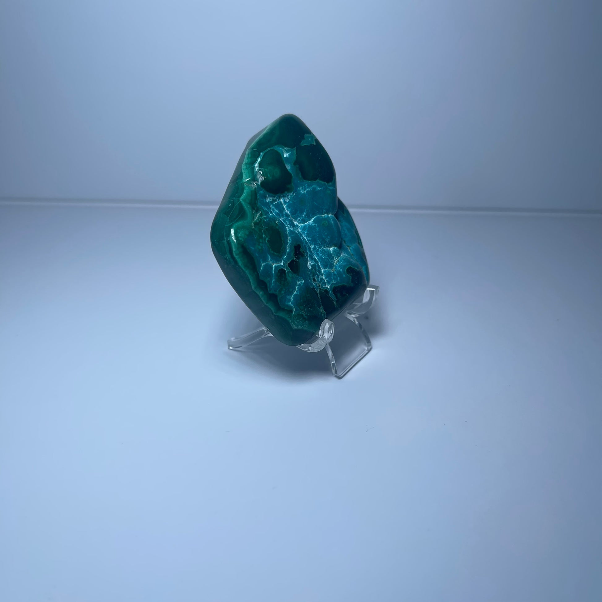 Bold and vibrant, this Chrysocolla Malachite freeform measures 2.5 inches long by 2.5 inches wide and weighs approximately 4 oz. Its swirling layers of deep green and turquoise blue create a striking natural pattern, embodying the union of calm communication and powerful transformation.