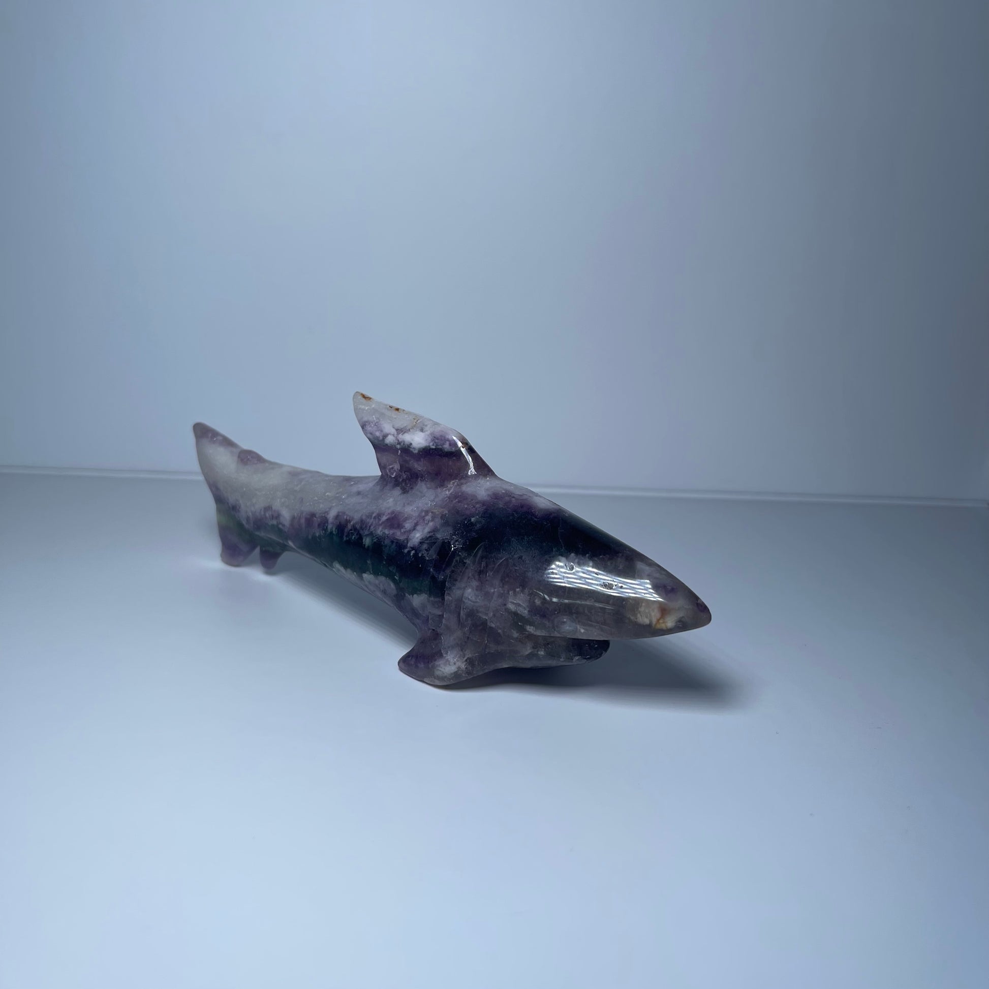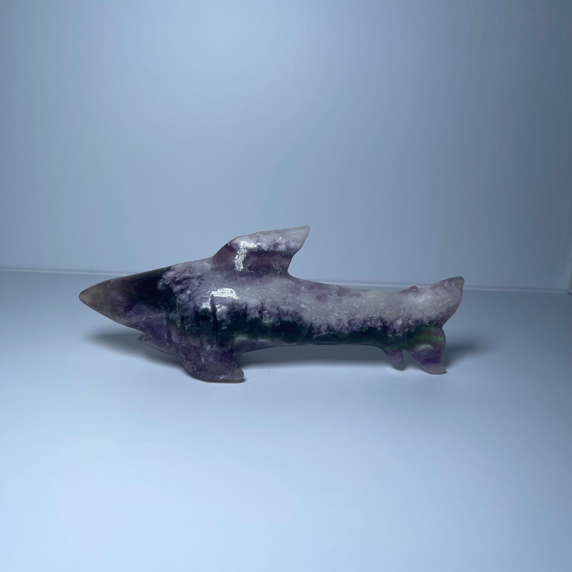 Fluorite is a stone of focus, intuition & harmony, helping to clear the mind while aligning thought & spirit. The purple tones awaken higher awareness, while the white brings cleansing, balance & renewal. In shark form — a creature of resilience, precision & instinct — these properties merge into a carving that embodies strength with purpose.