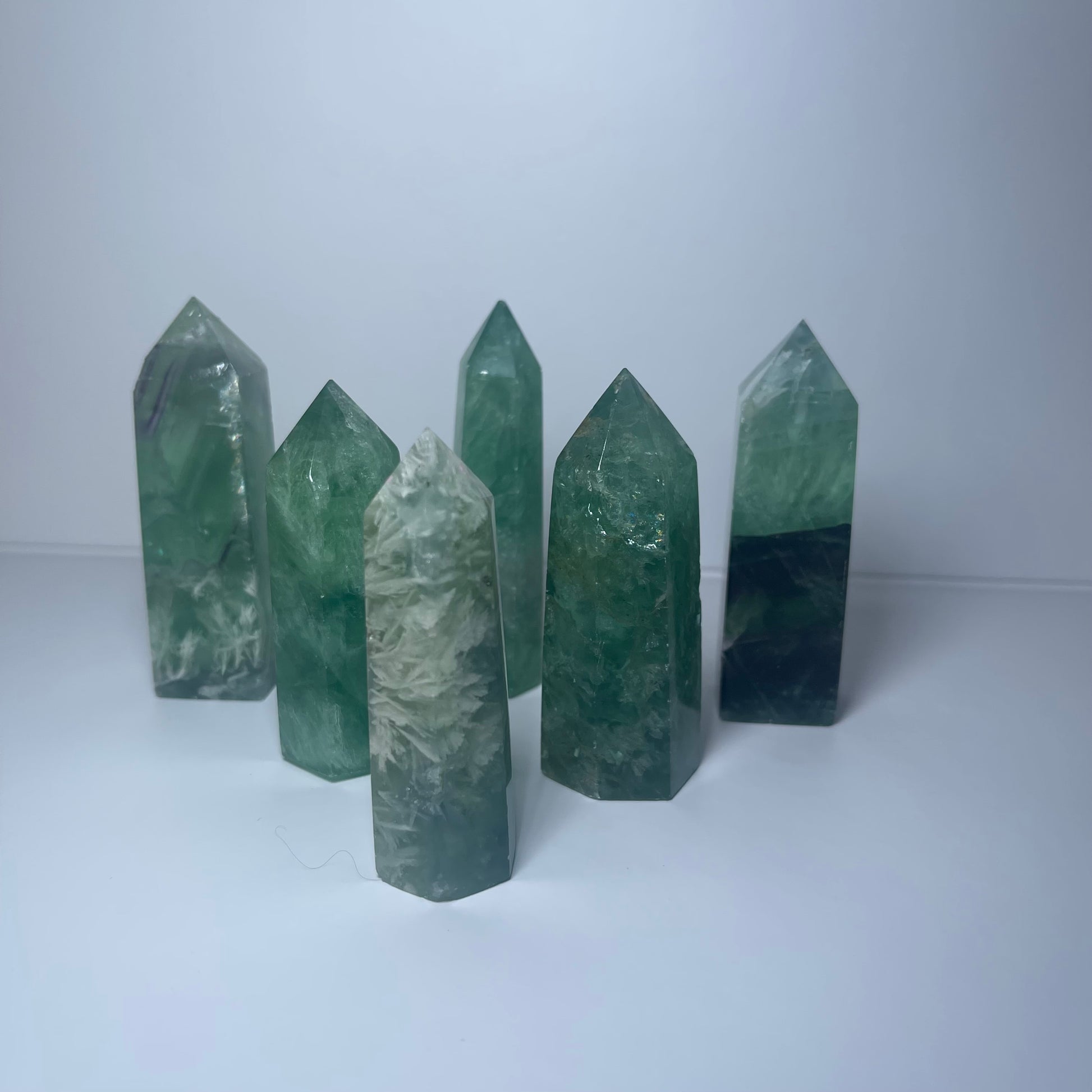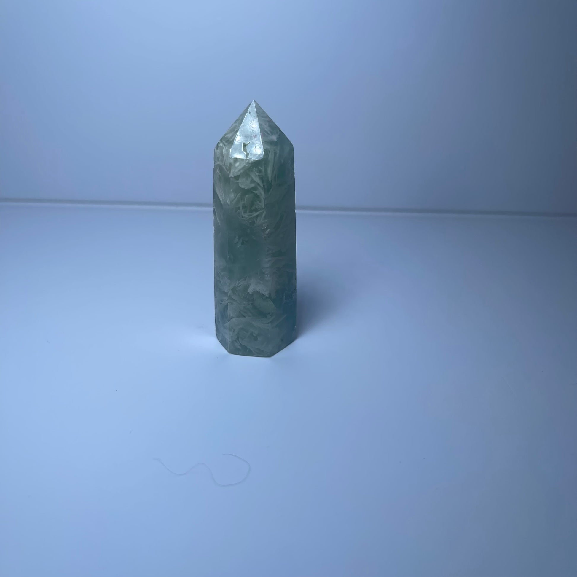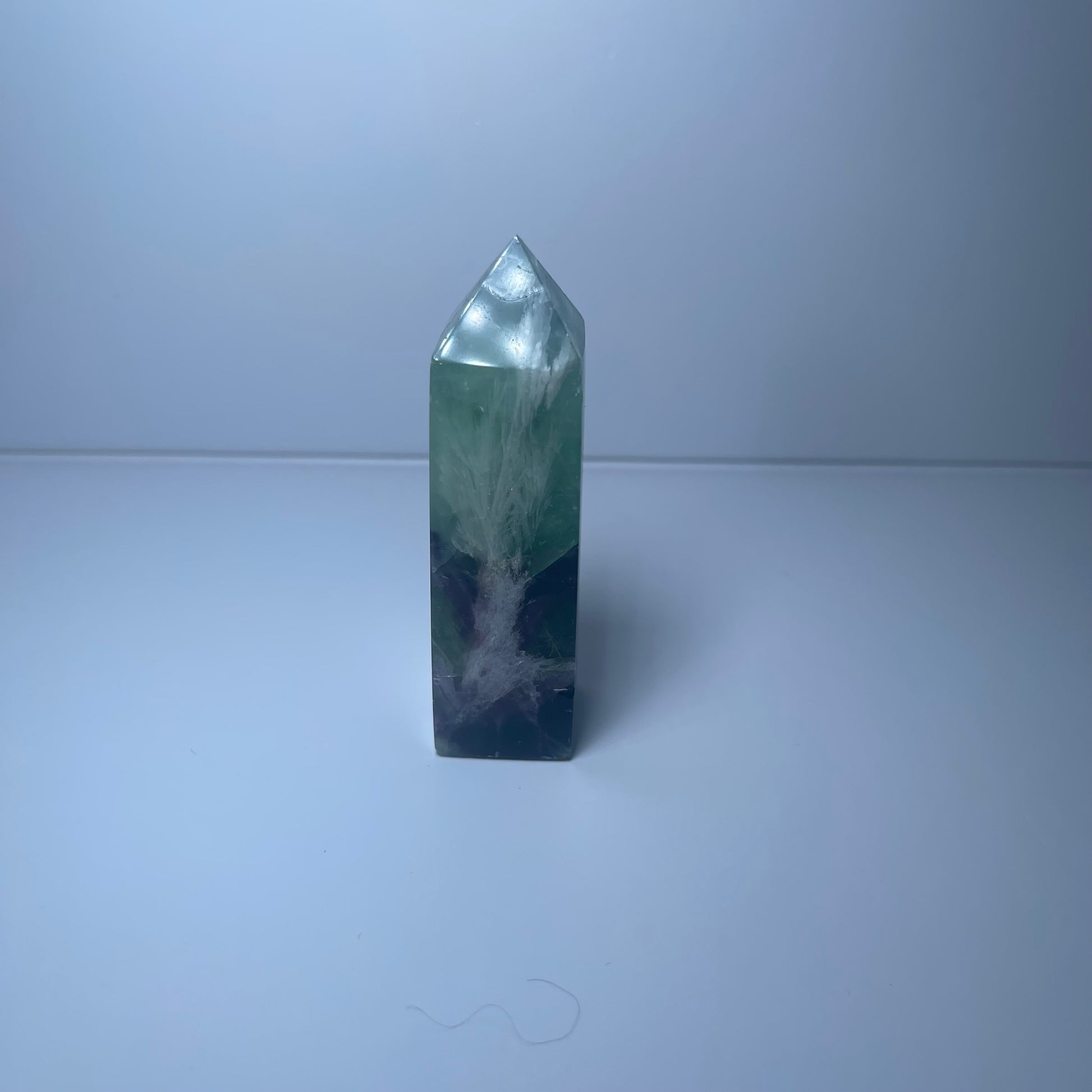 One intuitively chosen tower. Delicate and radiant, these Green Feather Fluorite Towers range from 3 to 3.5 inches tall and weigh between 2–3.8 oz. Their feathered green patterns, sone may be accented with purple hues, create a natural interplay of shadow & shimmer, evoking calm, focus, and clarity.