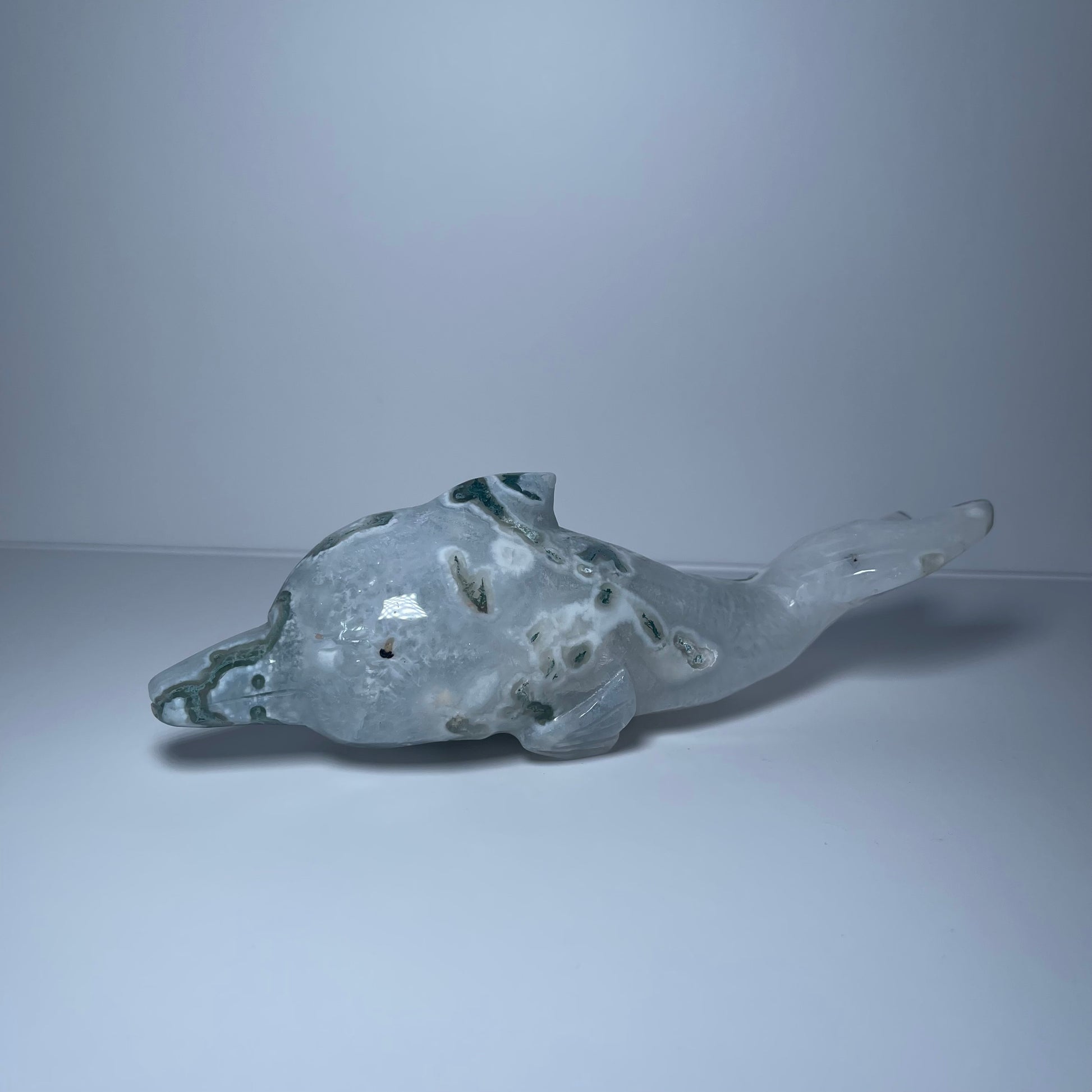 Carved with intention, this 7-inch Moss Agate Dolphin carries the soothing essence of the sea and the grounding spirit of the earth. Weighing just over 1 lb, it balances presence with elegance—an artful guardian for your sacred space.