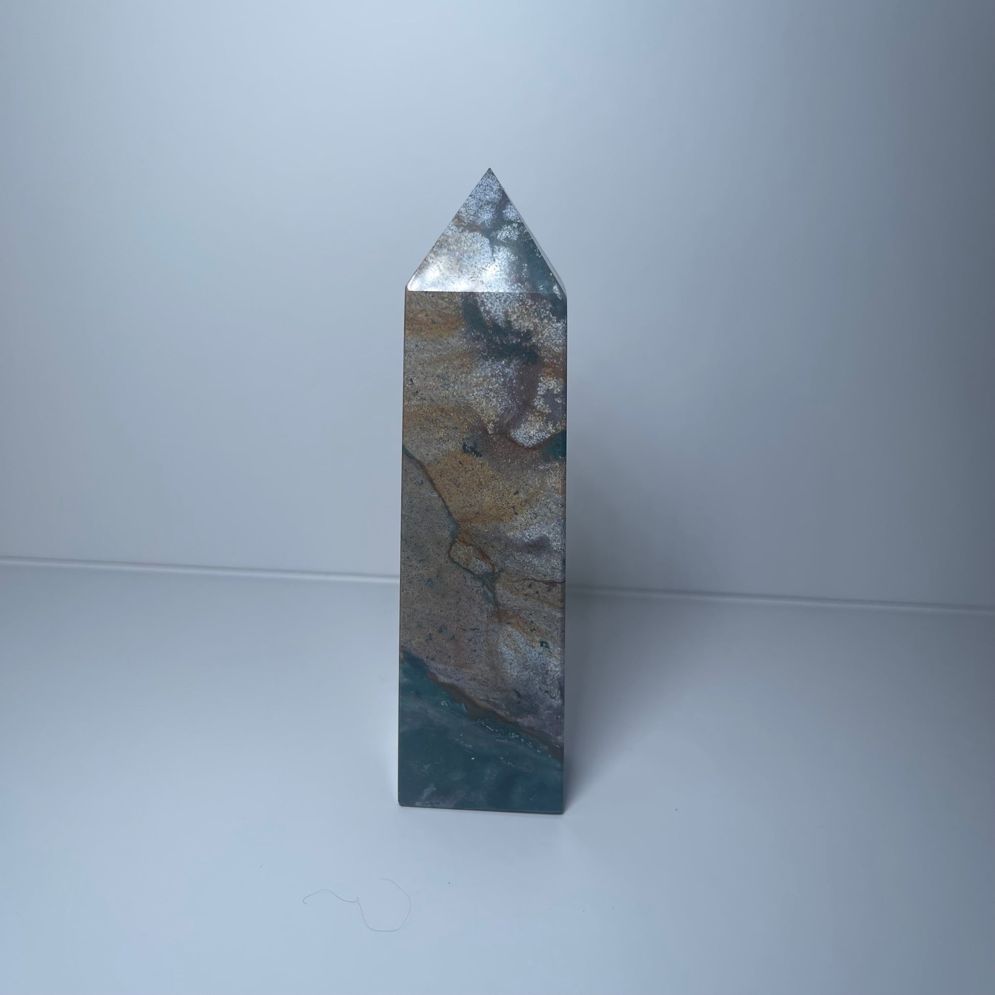 Grounding and serene, this Ocean Jasper Tower stands 5.5 inches tall and weighs approximately 9.7 oz. Its earthy brown and soft green hues flow together like waves meeting the shore, carrying the gentle rhythm of nature within its patterns.