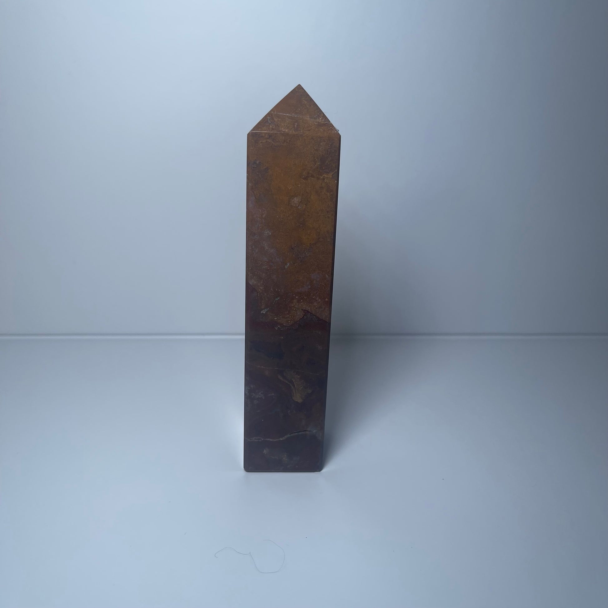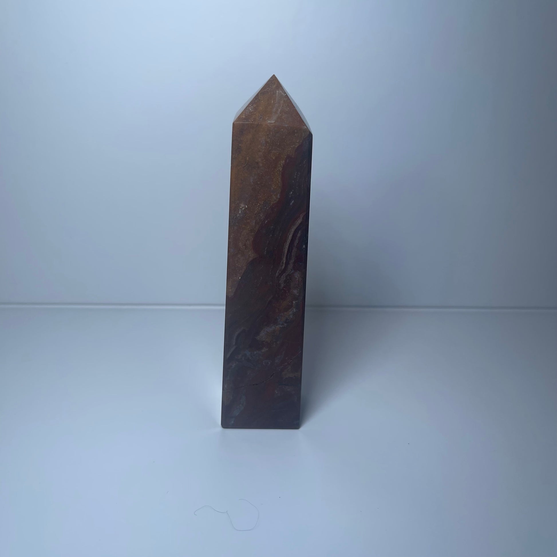 Warm and grounding, this Ocean Jasper Tower stands 5.25 inches tall and weighs approximately 8.3 oz. Its rich brown and red hues swirl across the surface like earthy tides, radiating natural strength and stability.