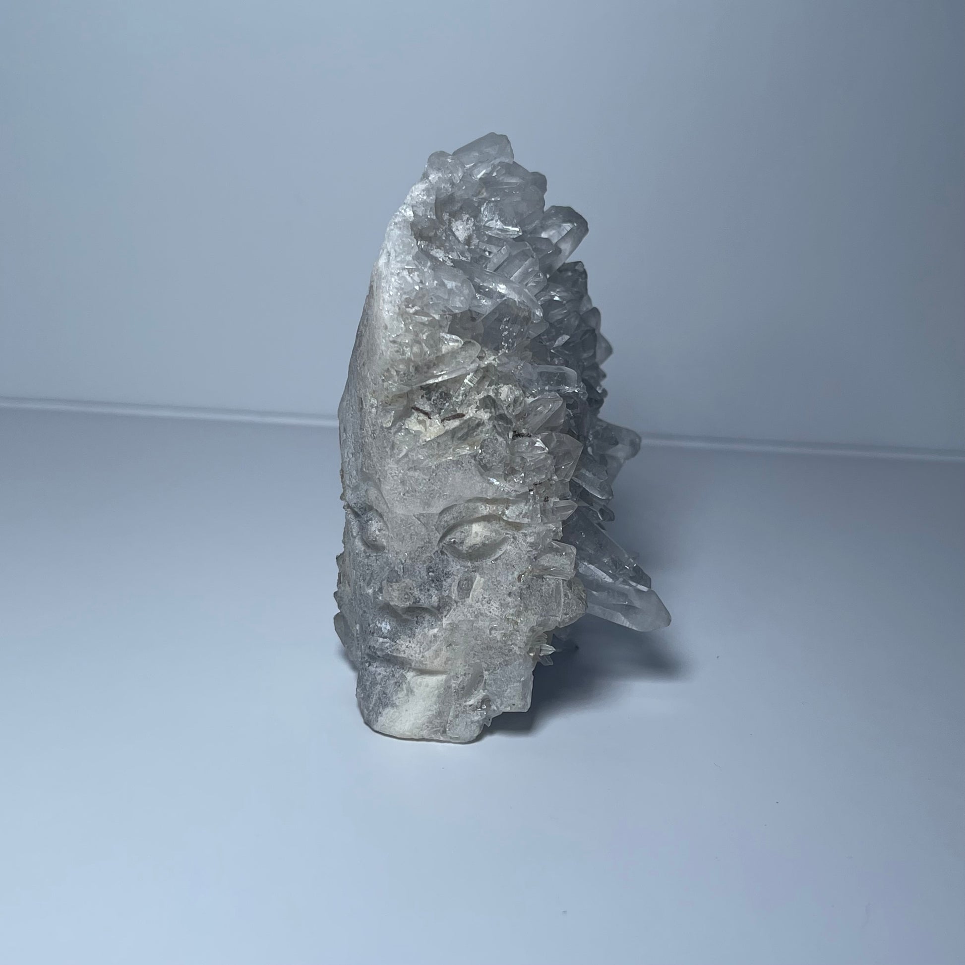 Mystical and radiant, this 3.5-inch Clear Quartz Cluster weighs approximately 10 oz. Its natural matrix is carved with a delicate face, blending shadow & shimmer to create a piece that is both grounding and spiritually uplifting.