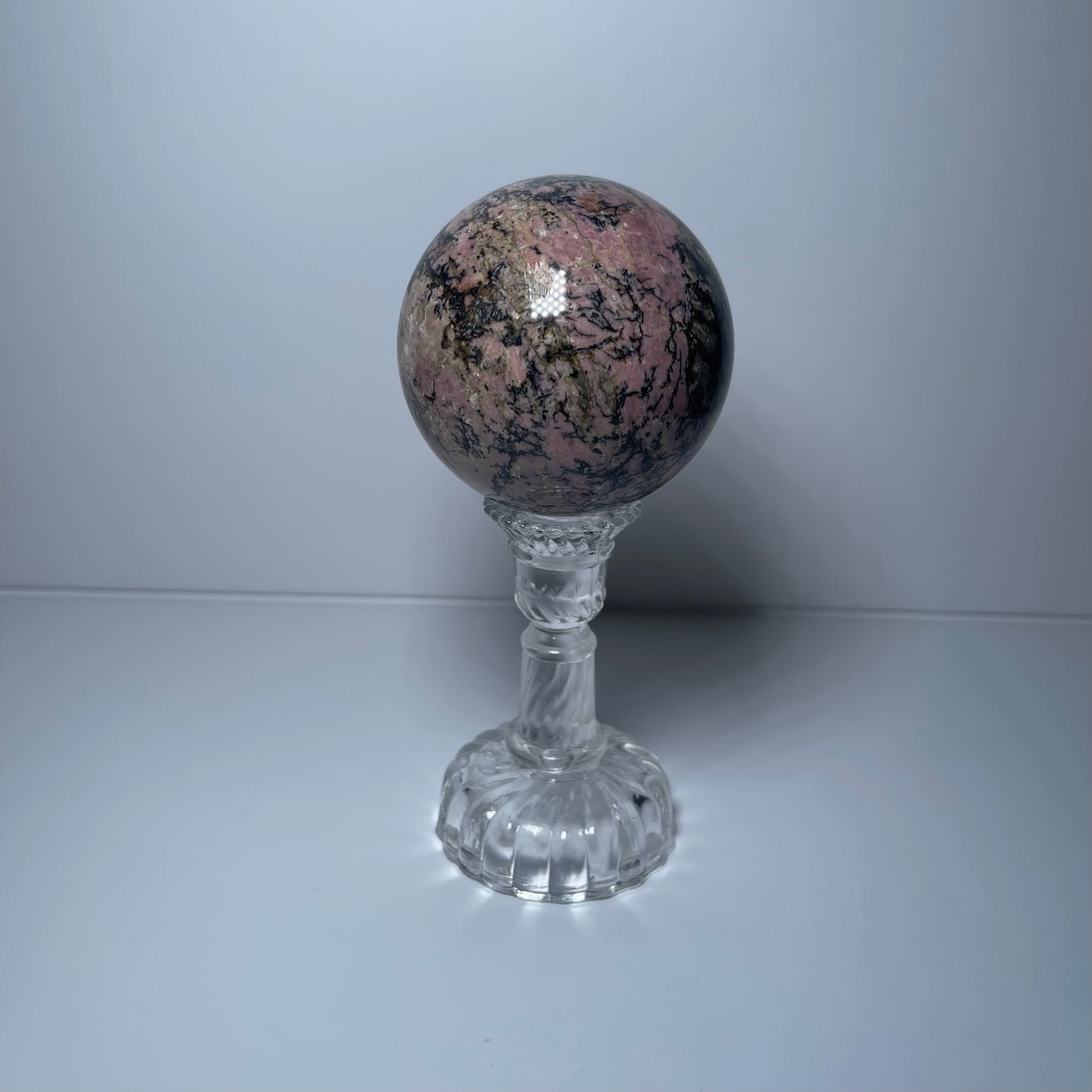 Radiant and grounding, this Rhodonite Sphere weighs 1 lb and glows with hues of rose and charcoal black veining — a natural balance of softness and strength. Its polished surface embodies compassion, forgiveness, and the beauty of emotional equilibrium.