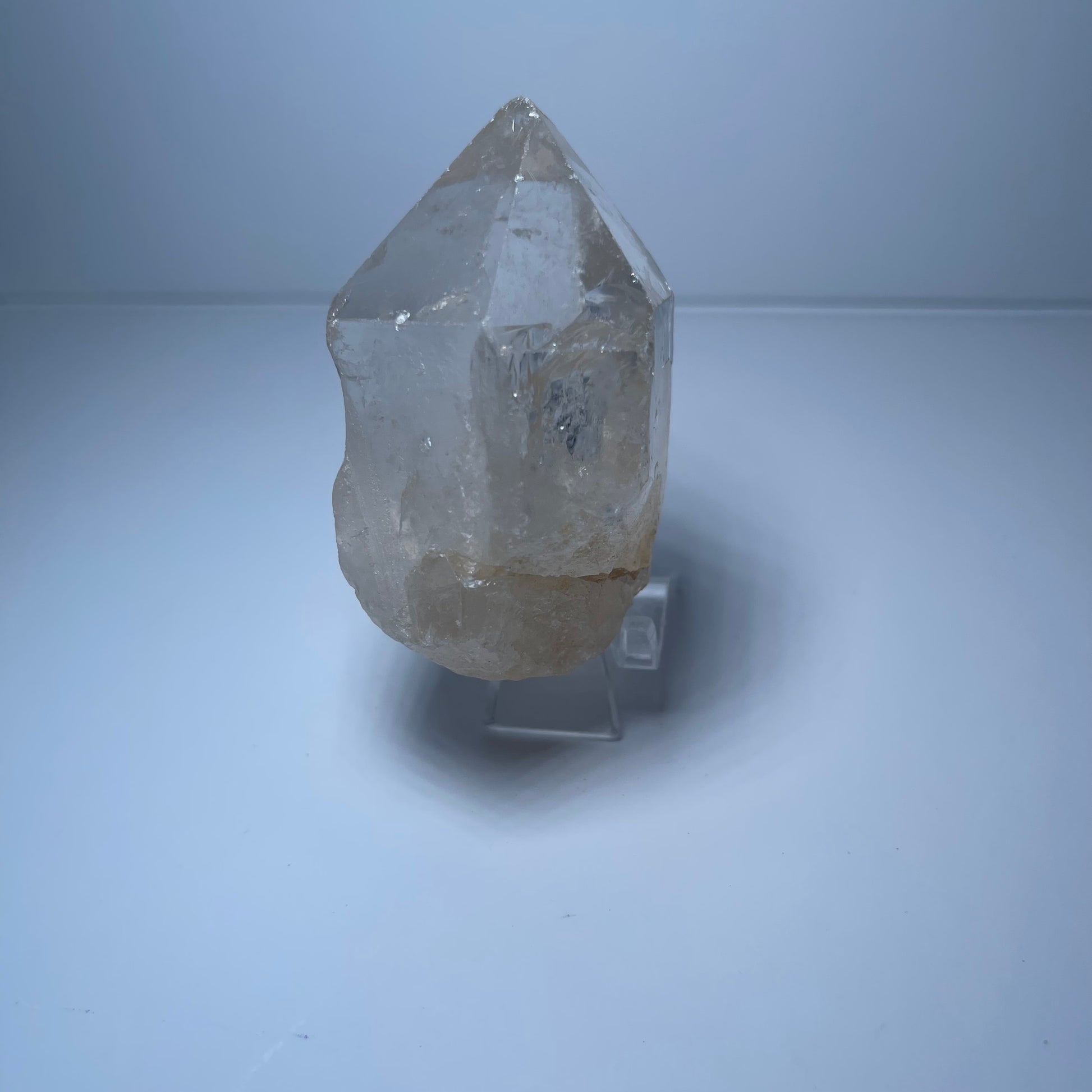 Mined by hand in Mt. Ida, Arkansas, The Lantern gleams with the soft, steady glow of inner illumination. Its clear, tapering point and subtly golden inclusions evoke the image of a flame held within glass — a guiding light in crystalline form.