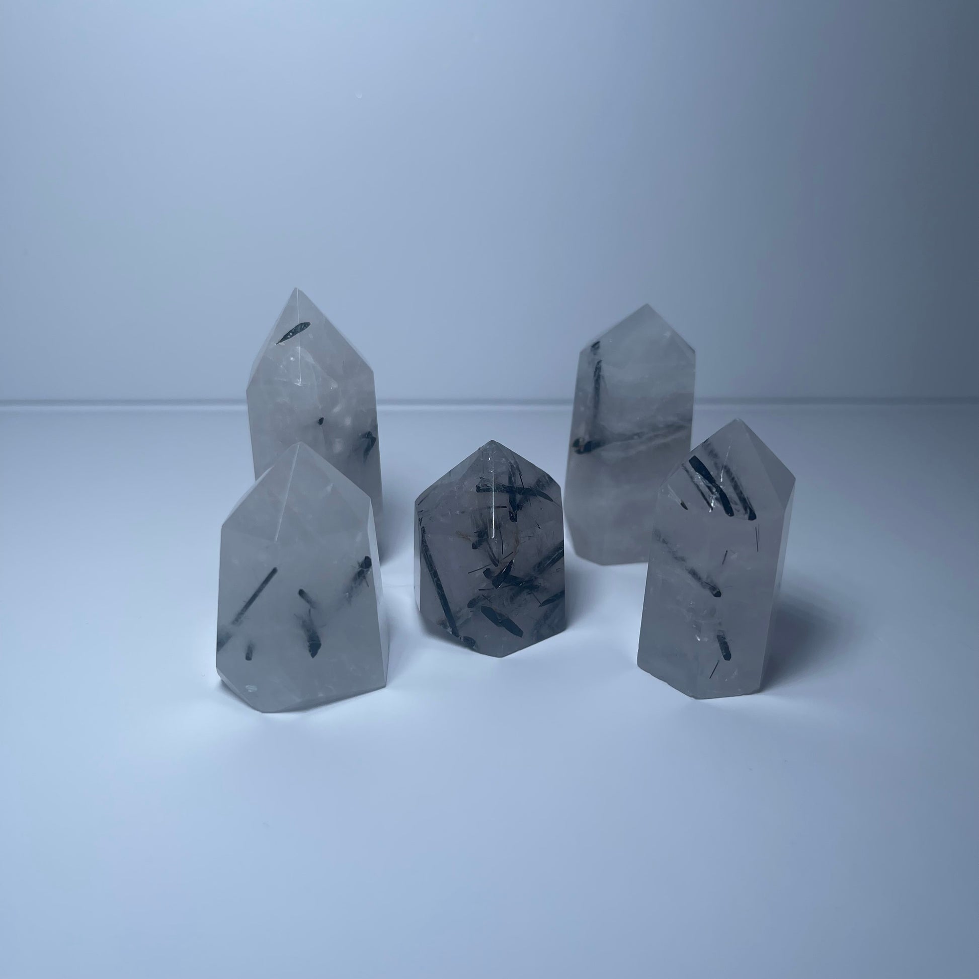 One intuitively chosen tower. Small yet powerful, these Tourmalinated Quartz Towers range from 1 to 2 inches tall and weigh between 1–1.5 oz. Each tower features striking black tourmaline inclusions threaded through clear quartz, creating a dramatic contrast of light & shadow within the stone.
